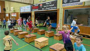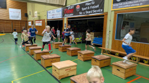 Die beiden Trainer Egon Koch und Sven Schieritz haben jedes Mal zu Beginn ein interessantes Programm, bei dem die sportliche Grundausbildung der Kinder gefördert wird. Das sind Übungen mit Kästen, mit Langbänken, Reifen und auch Seilen und die Schüler machen mit Begeisterung mit und wärmen sich auf.