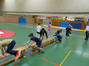 Jeden Montag waren meistens über 20 Grundschüler beim Training und hatten viel Spaß zunächst bei einer allgemeinen sportlichen Grundausbildung mit Kästen, Bänken, Reifen, Seilen und anderen Geräten.